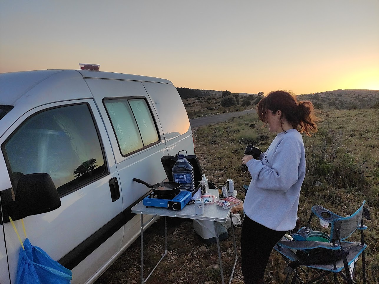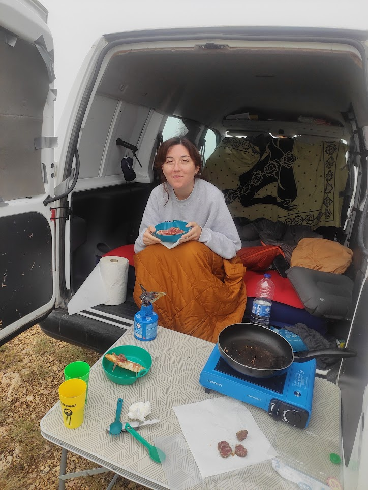 In 2022, I encouraged Julia to take a van trip together. Our first experience together was a getaway to Pitarque, Teruel. For her, who had never imagined enjoying the hippie van life, it was quite a trial by fire. We slept on an air mattress with sleeping bags. Thank goodness I brought my 0-degree sleeping bag, because Julia gets very cold and, although it was summer, the nights in Teruel get quite cool. We cooked with the basics we brought from home.